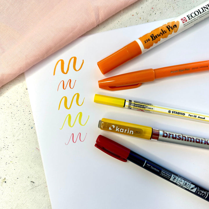 Gelb/Orangetöne - Karin (Gold 283), Ecoline (Hellorange 236), Stabilo (568/24), Pentel (Orange), Fudenosuke (red)