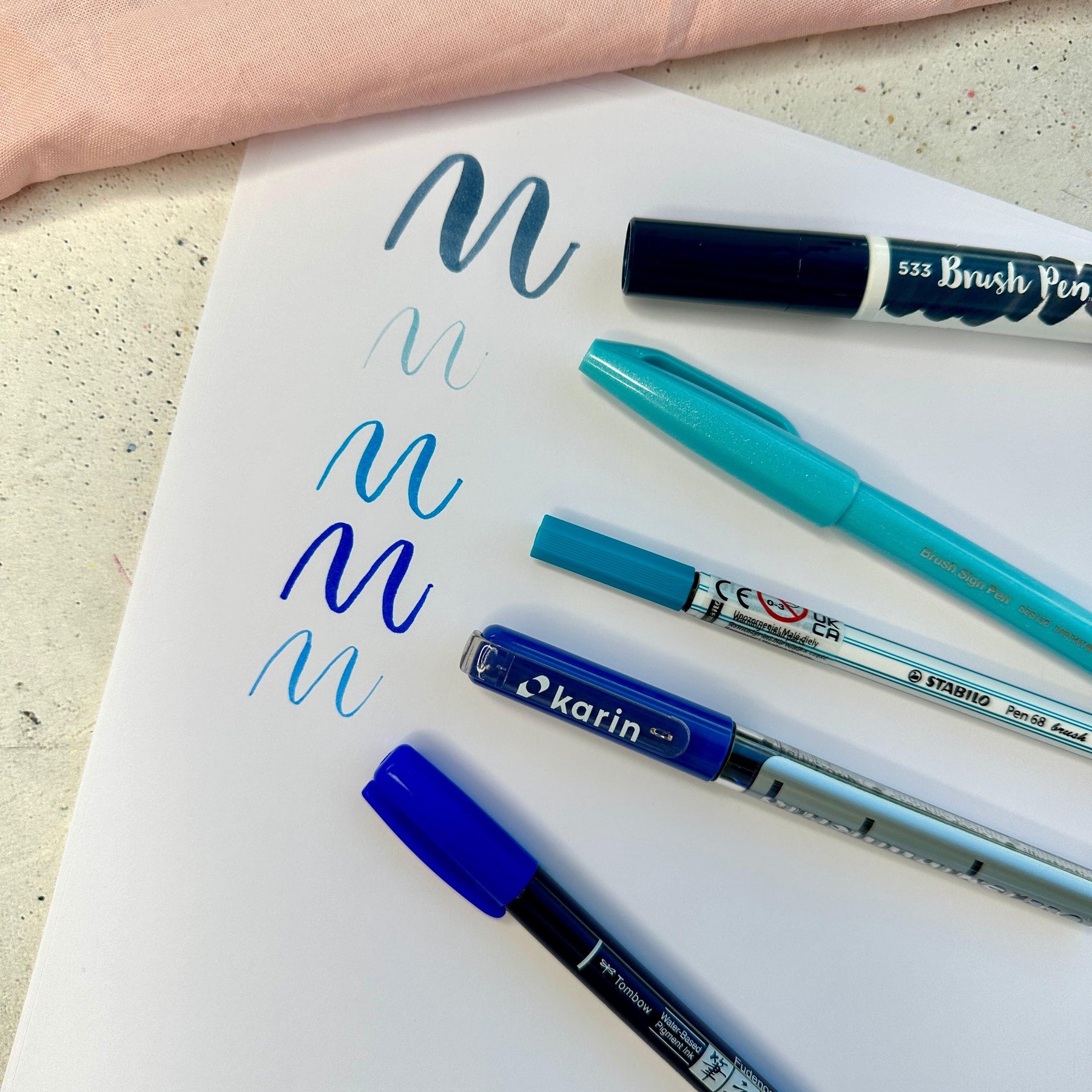 Blautöne - Karin (Royal Blue 045), Ecoline (Indigo 533), Stabilo (568/31), Pentel (Pale Blue), Fudenosuke (blue)
