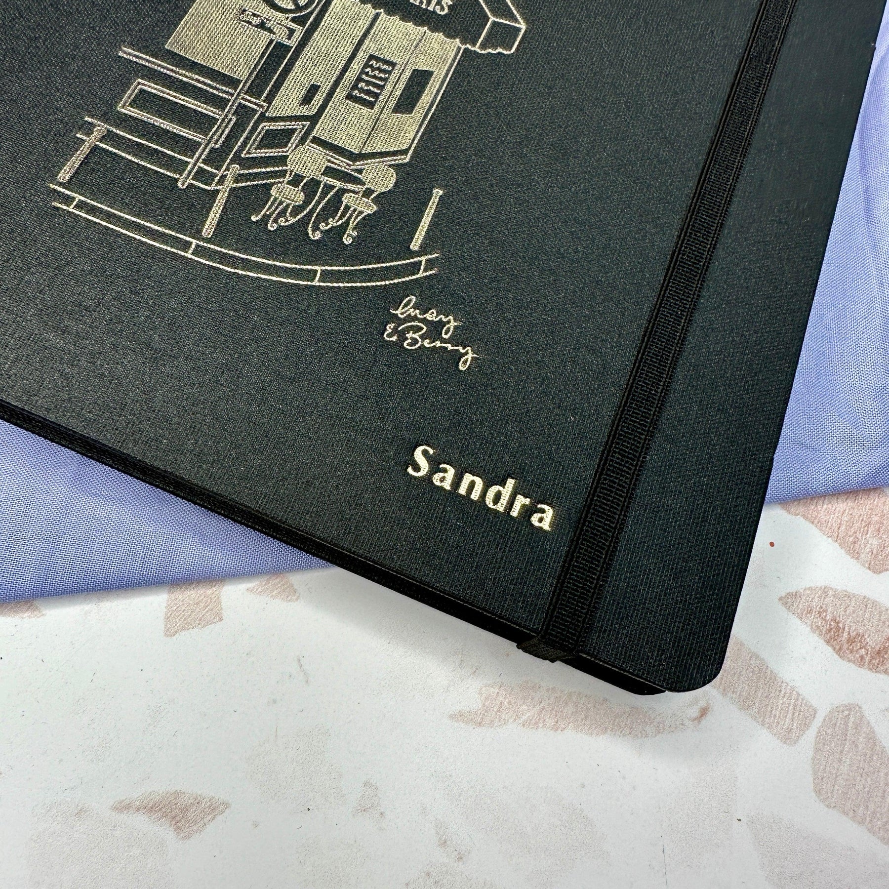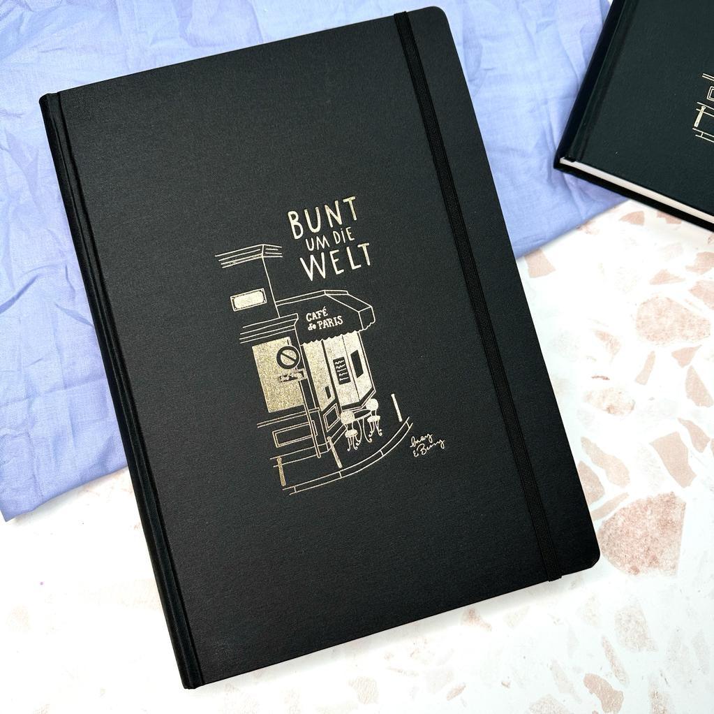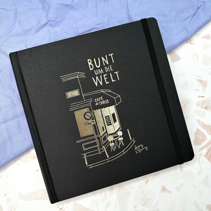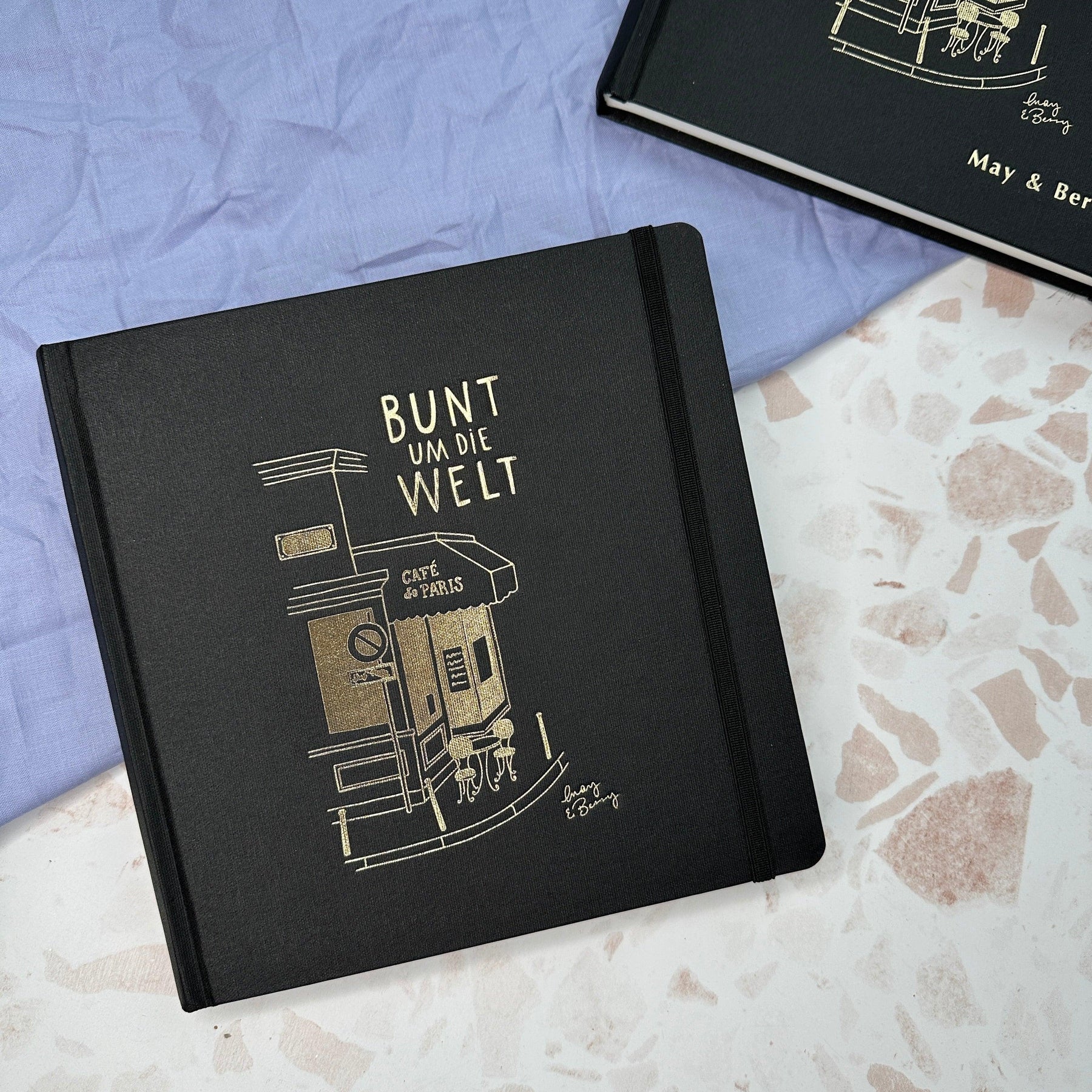 Jedes Buch wird von uns per Hand mit dem goldenen "Bunt um die Welt" Motiv geprägt und kann auch noch personalisiert werden.