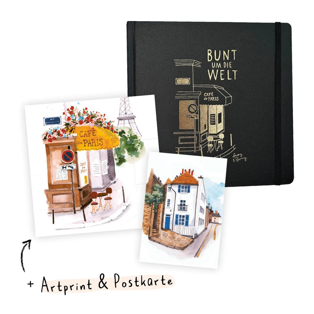 Zusätzlich zum Watercolour Book erhältst du als Goodie einen Artprint und eine Postkarte.
